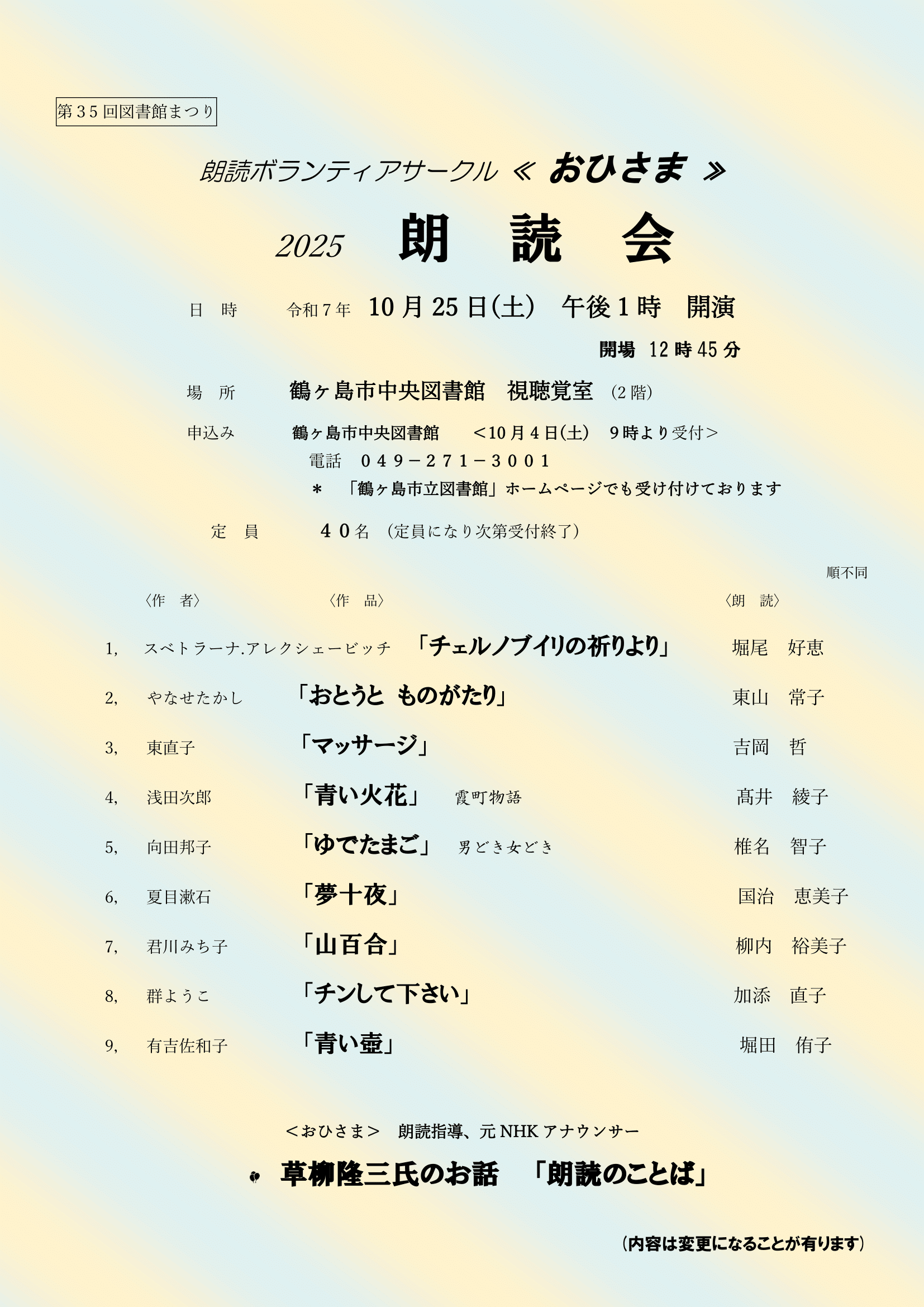 詳細内容 | 朗読サークルおひさまによる朗読発表会 主催:朗読ボランティアサークルおひさま |