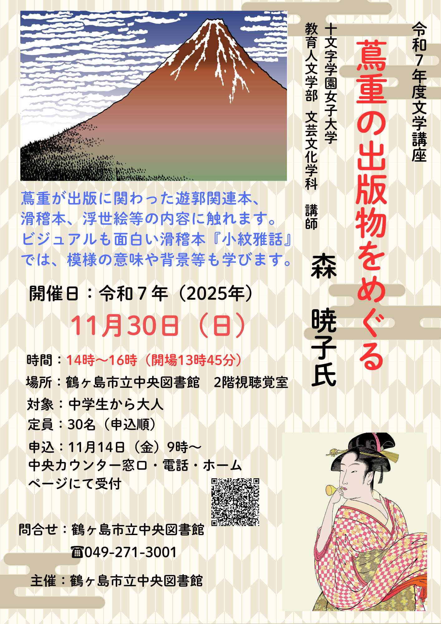 詳細内容 | 蔦重が出版に関わった遊郭関連本、 滑稽本、浮世絵等の内容に触れます。 ビジュアルも面白い滑稽本『小紋雅話』 では、模様の意味や背景等も学びます。 主 催:鶴ヶ島市立中央図書館 |