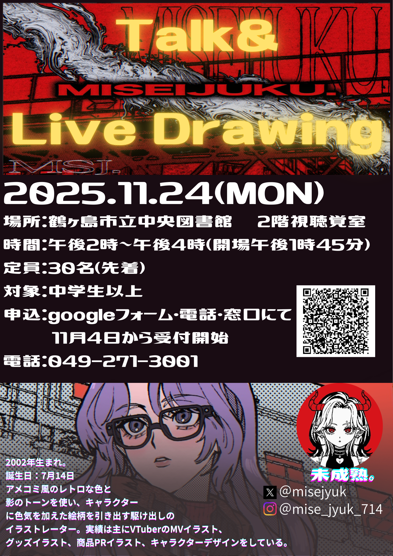 詳細内容 | その場で描く!その場で魅せる!ライブドローイングイベント開催! 「イラストレーターになりたい」 「絵を描くのが好き」 そんな中高生に贈る、特別なアート体験。 プロのイラストレーター 未成熟。さんが、 目の前で一枚の絵を描き上げるライブドローイングを開催します! 「どうやって描いてるの?」 「どんな道具を使ってるの?」 普段は見られない制作の裏側を、リアルタイムでじっくり観察。 描き方のコツや、みなさんからの質問にもお答えいただく予定です。 将来の参考になるヒントが満載! 絵を描くことが好きな中高生、ぜひこの機会に“本物の現場”を体感してください! ※自分の作品を持って来ると、未成熟。さんがアドバイスをくれます! |