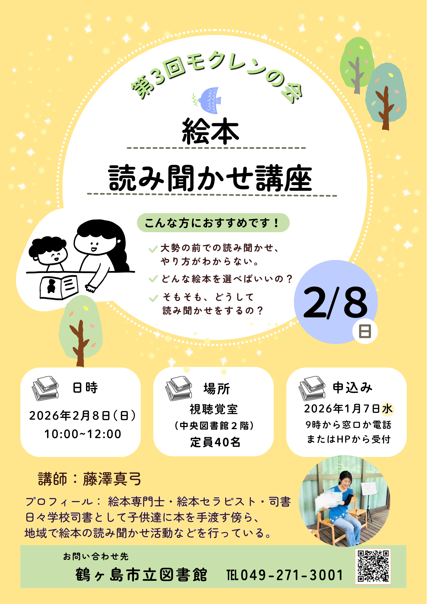 | 申込み | 2026年1月7日(水曜日)9時から中央図書館へ直接、☎271・3001、または申込フォームから |