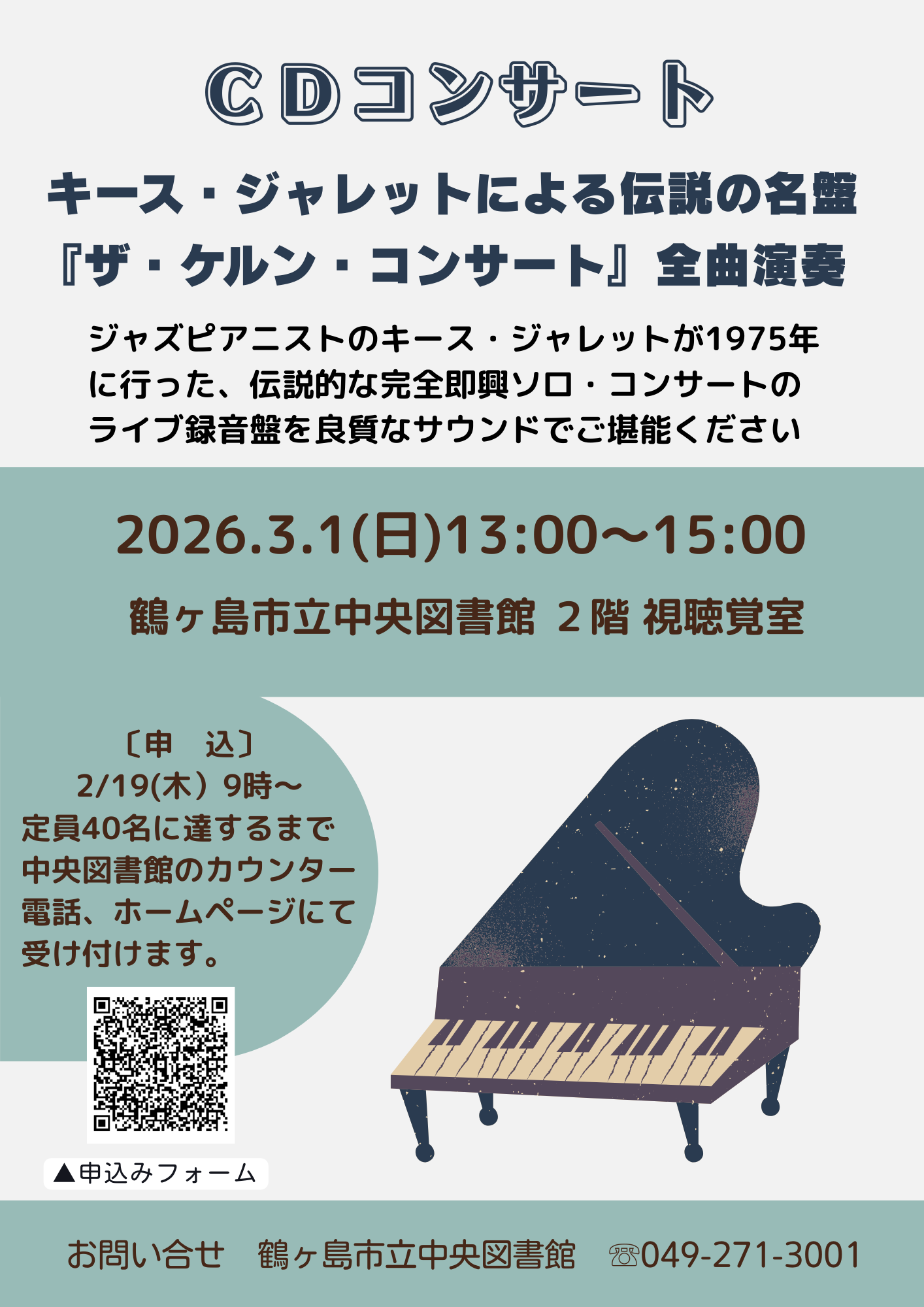 | 申込み | 2月19日(木曜日)9時~申込フォームまたは中央図書館のカウンター・電話にて受付 |