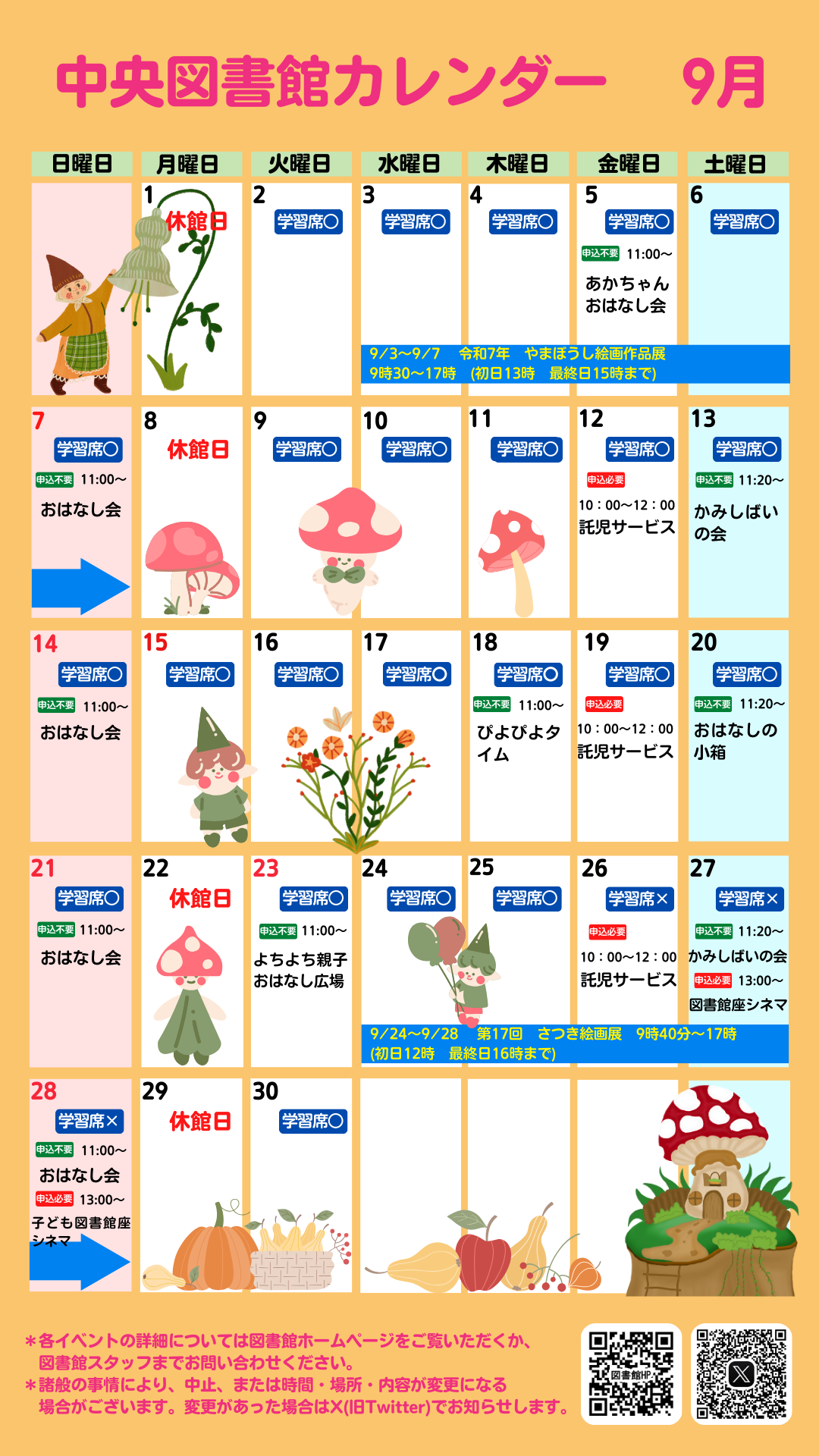 中央図書館カレンダー9月 中央図書館カレンダー9月を公開いたします。 (予定が変更になる場合は、図書館のホームページやSNSでお知らせいたします)
