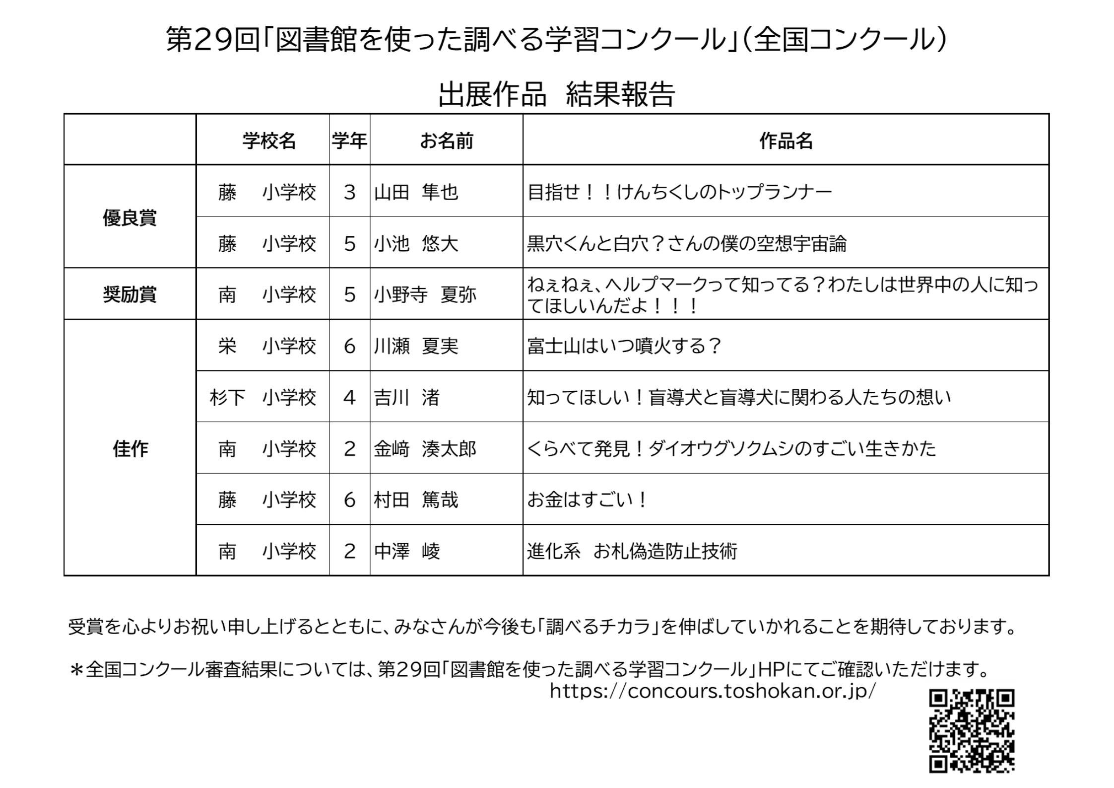 鶴ヶ島市地域コンクールにて、上位8作品につきましては、公益財団法人図書館振興財団主催「第29回図書館を使った調べる学習コンクール 全国コンクール」に推薦作品として出展いたしました。