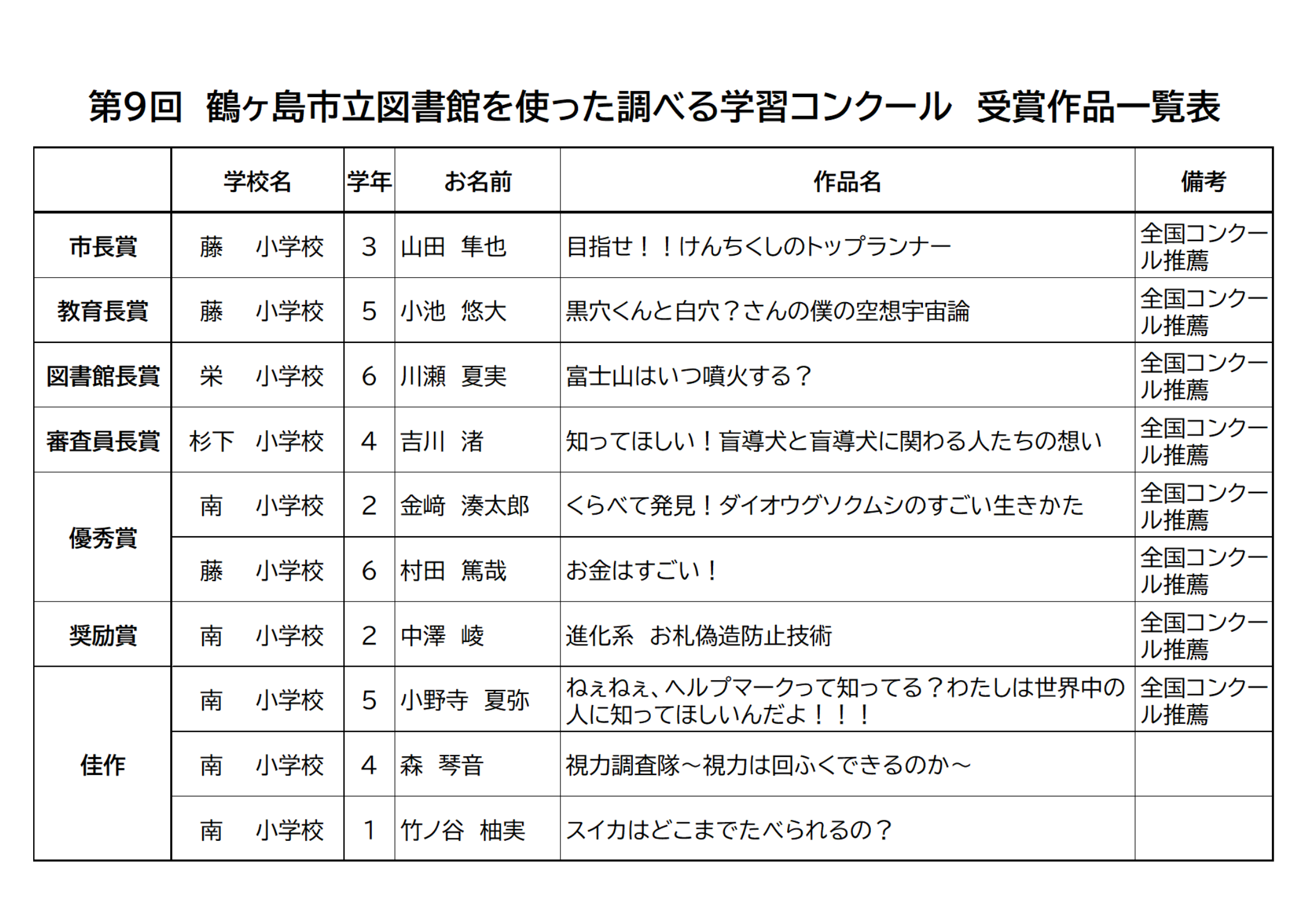 第9回鶴ヶ島市立図書館を使った調べる学習コンクール受賞者一覧表
