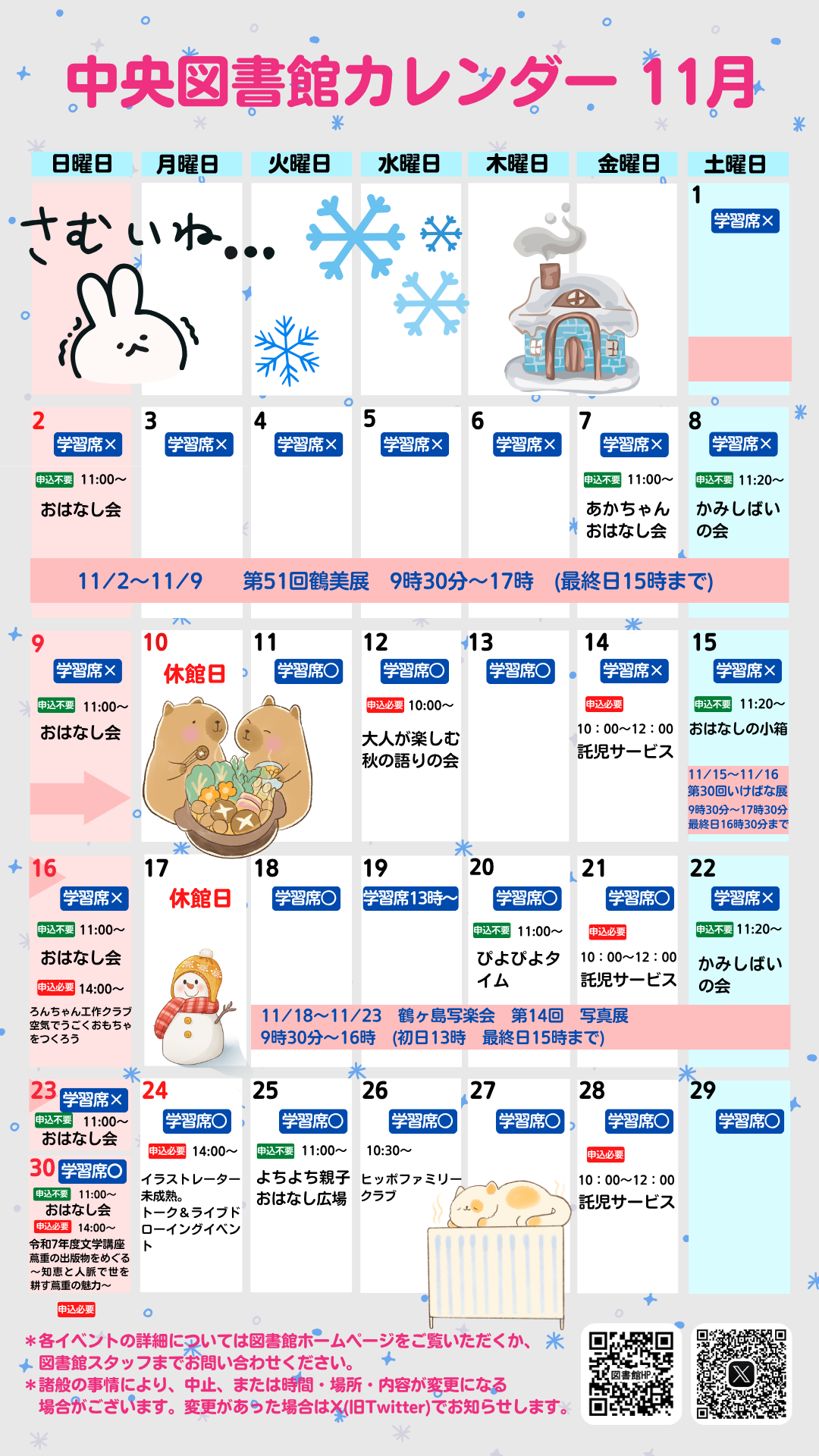 中央図書館カレンダー11月 中央図書館カレンダー11月を公開いたします。 (予定が変更になる場合は、図書館のホームページやSNSでお知らせいたします)