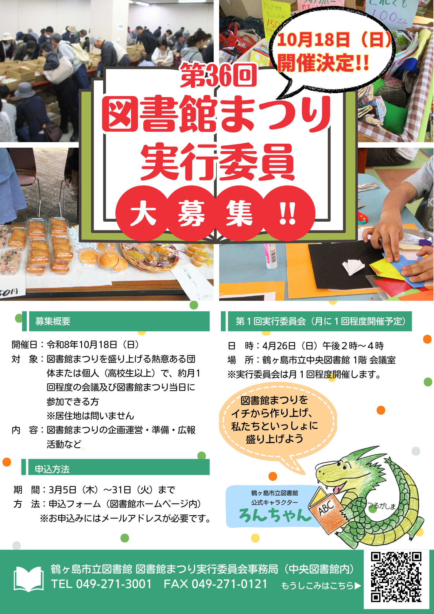 鶴ヶ島市立図書館の一大イベント、図書館まつりの開催にご協力いただける方を募集します。