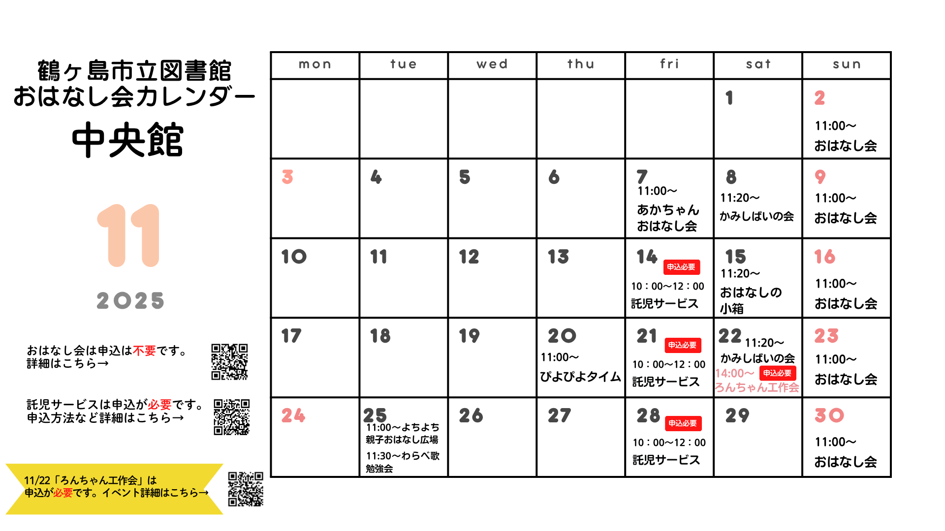 中央図書館と各分室で2025年11月に開催する「おはなし会」の開催予定日をお知らせいたします。