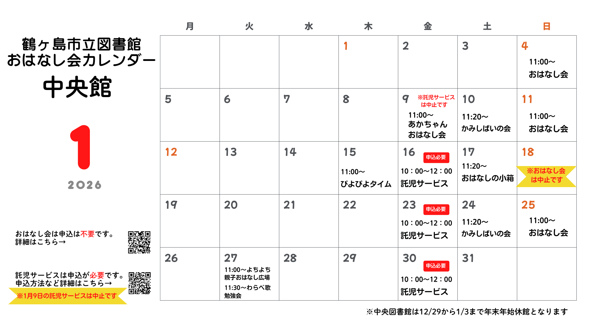 ※中央図書館の1月18日のおはなし会は都合により中止いたします。