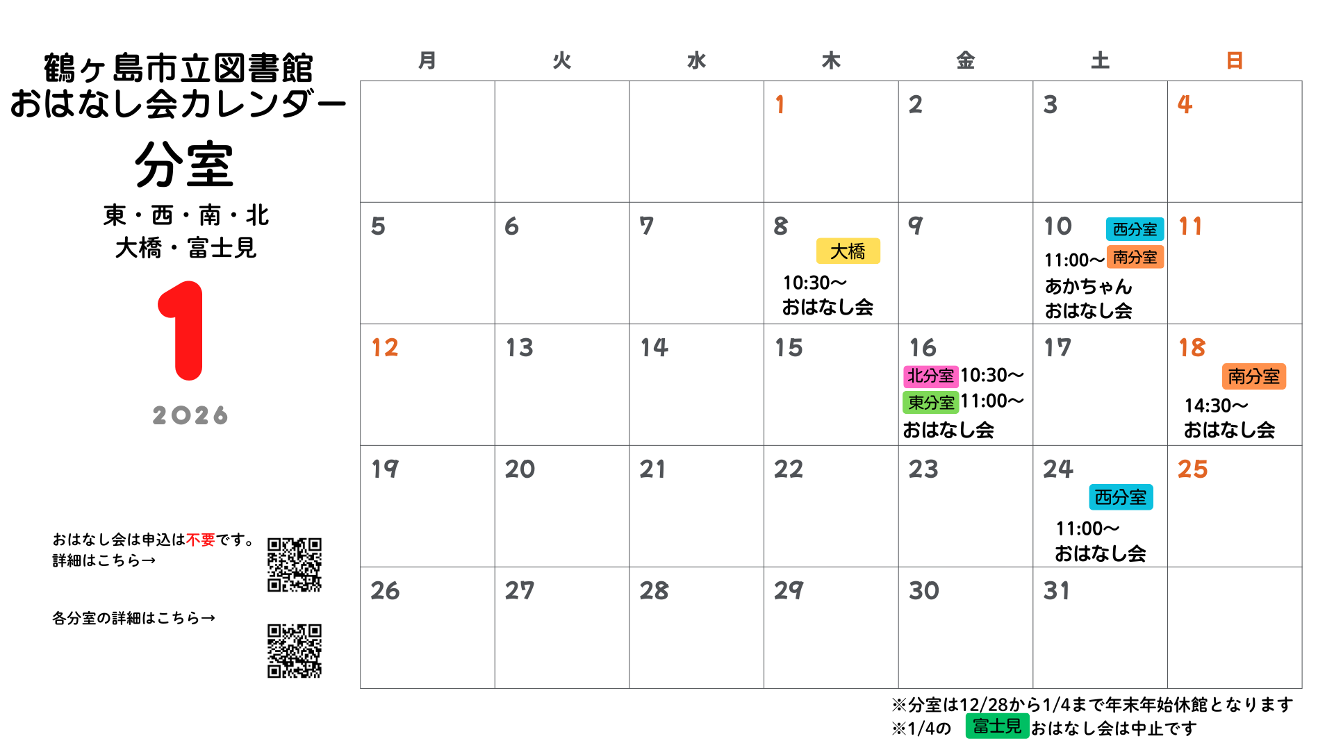 中央図書館と各分室で2026年1月に開催する「おはなし会」の開催予定日をお知らせいたします。