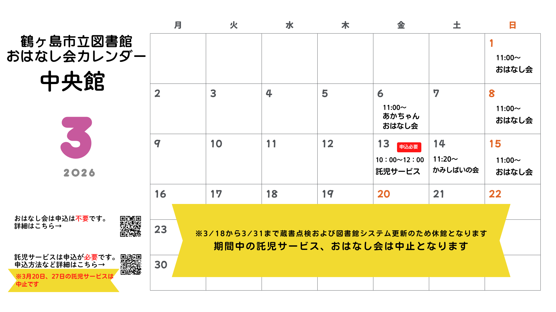 期間中の託児サービス、おはなし会は中止となります