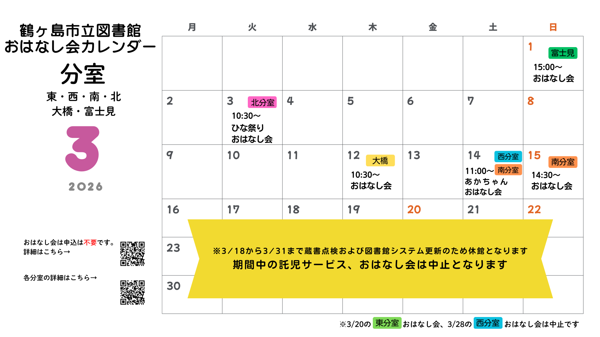 中央図書館と各分室で2026年3月に開催する「おはなし会」の開催予定日をお知らせいたします。